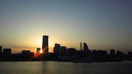 夕陽が落ちる頃、大桟橋(デートスポットです)から、みなとみらい地区を眺めた写真です。