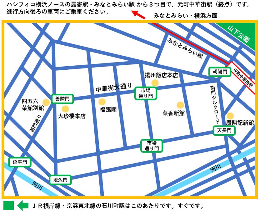 一方、みなとみらい地区を散策し、桜木町駅のほうに向かったら、JR根岸線(京浜東北線)が便利です。石川町駅から中華街の延平門までは徒歩5分程度です。