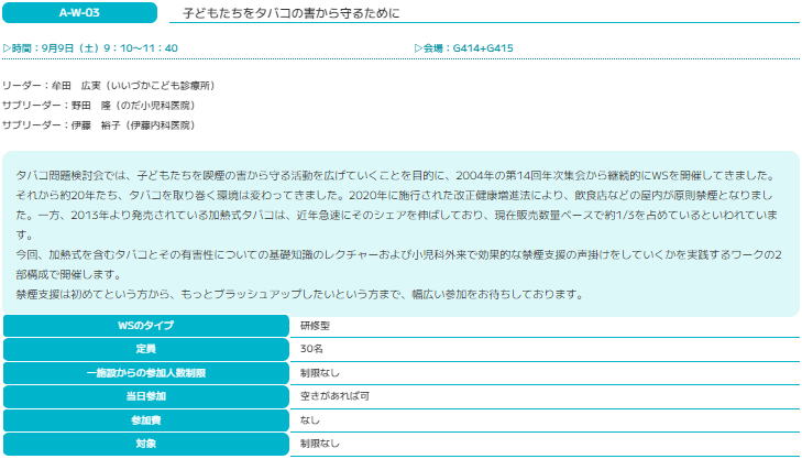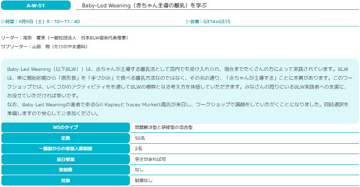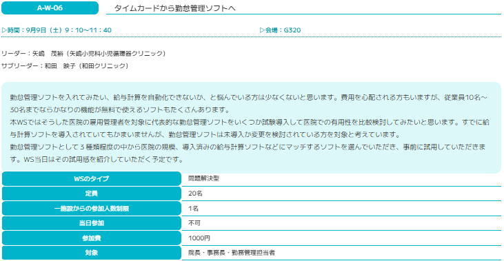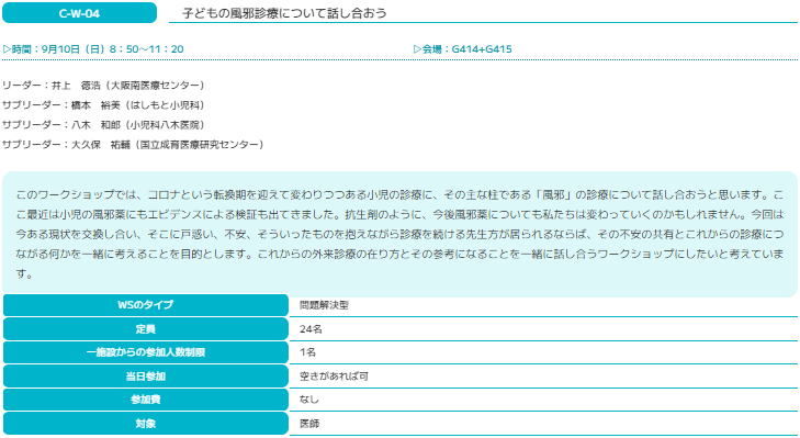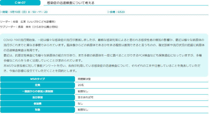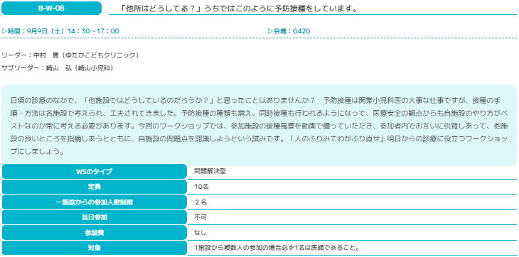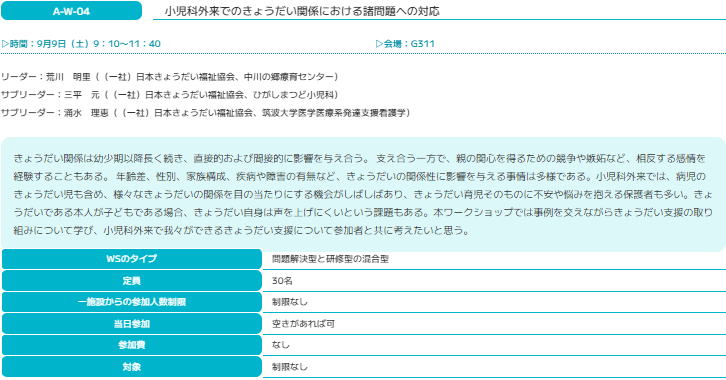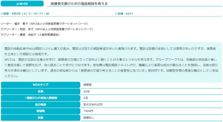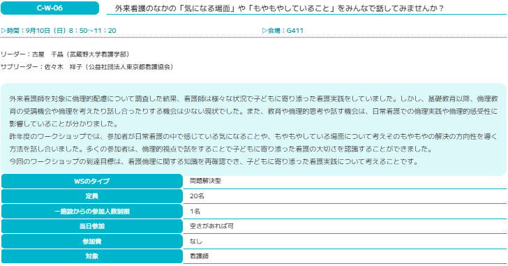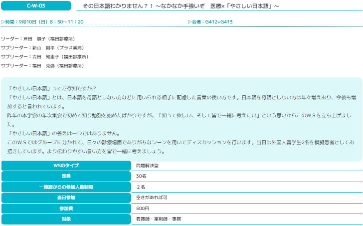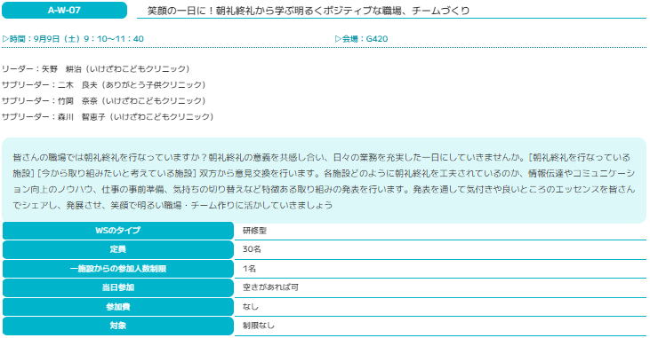 明日のあなたをバージョンアップする、 参加することによってその後の行動が変容する、 それがワークショップです。 いろいろな企画が集まりました。 聴いて、話して、考えて、 濃密な時間を楽しんでください。 実行委員会が企画した 「拡大ワークショップ」もあります。 奮ってご参加ください。