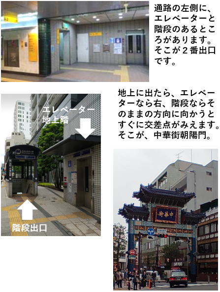元町・中華街駅の改札を出て、中華街まで続く駅の地下通路はやや長いです。2番出口から降りると迷わず中華街の入口(朝陽門)に行くことができます。