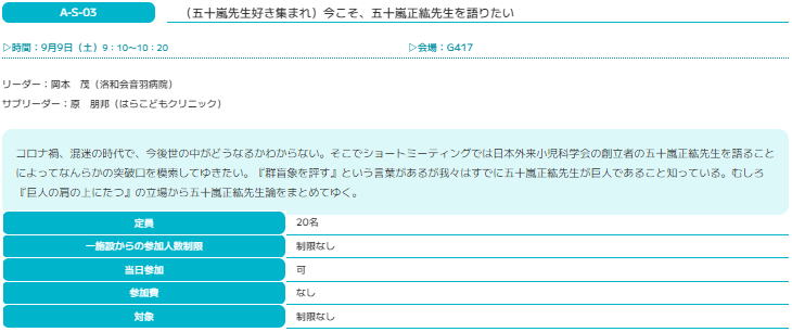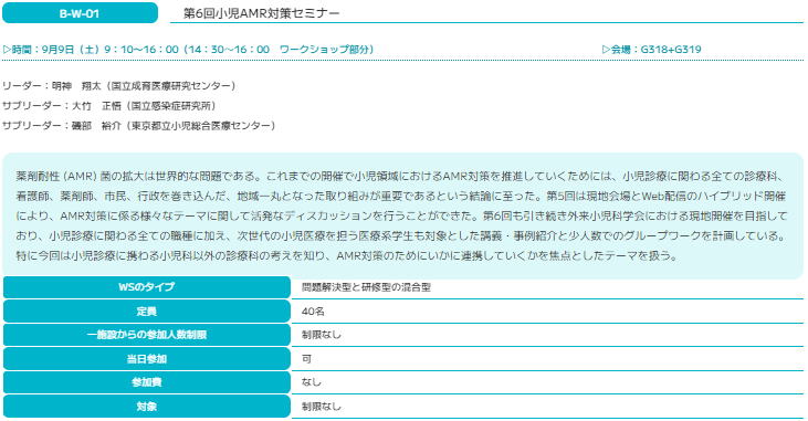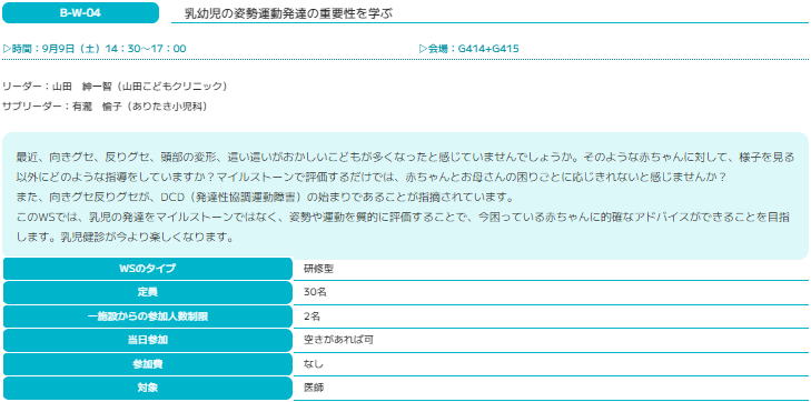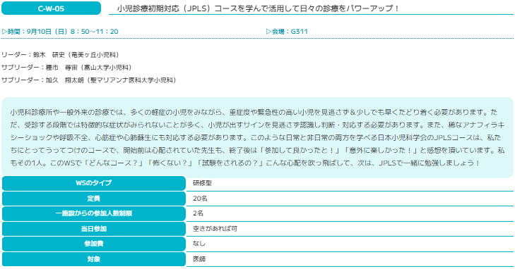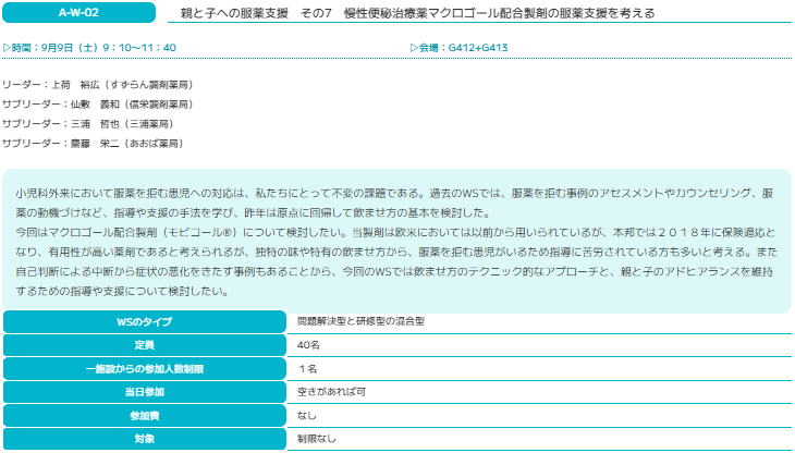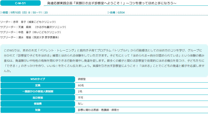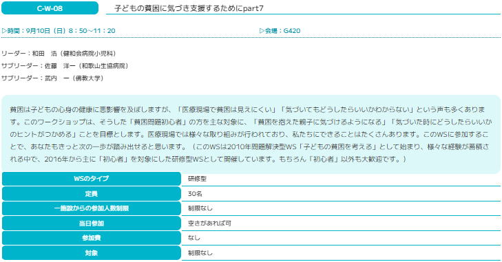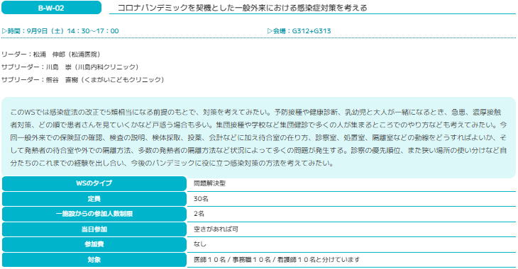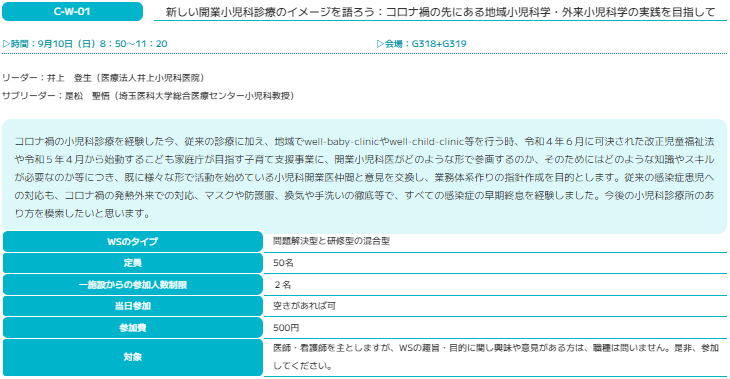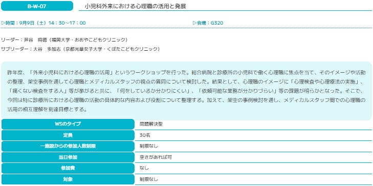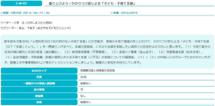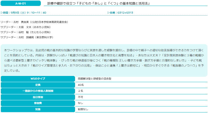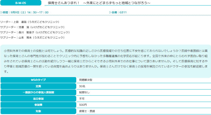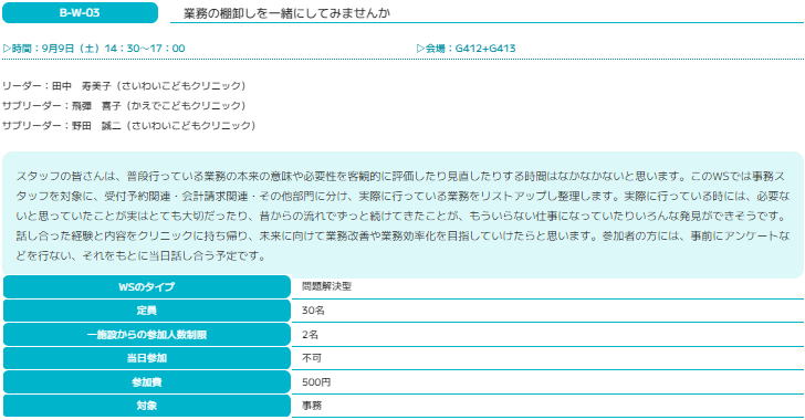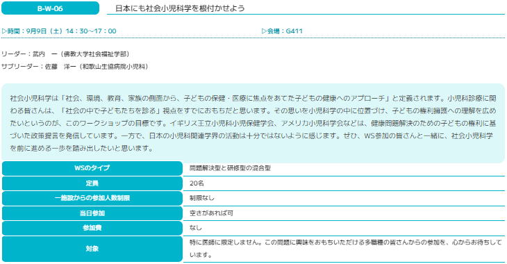 明日のあなたをバージョンアップする、 参加することによってその後の行動が変容する、 それがワークショップです。 いろいろな企画が集まりました。 聴いて、話して、考えて、 濃密な時間を楽しんでください。 実行委員会が企画した 「拡大ワークショップ」もあります。 奮ってご参加ください。